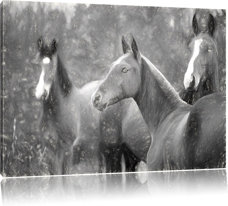Pixxprint schöne Pferde auf der Wiese Kunst Kohle Effekt, Format: 100x70 auf Leinwand, XXL riesige B