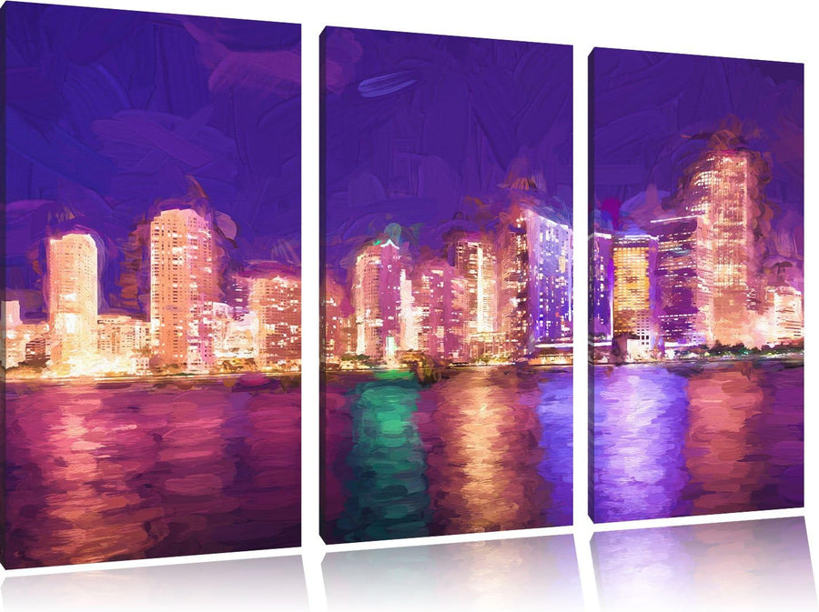 Pixxprint Schöne Nacht-Szene Skyline von Miami Florida Kunst Pinsel Effekt 3-Teiler Leinwandbild 120