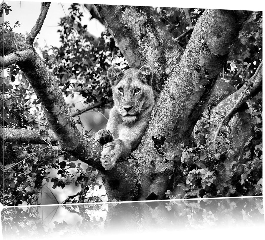 Pixxprint schöne Löwin auf Baum als Leinwandbild/Grösse: 100x70 / Wandbild/Kunstdruck/fertig bespann