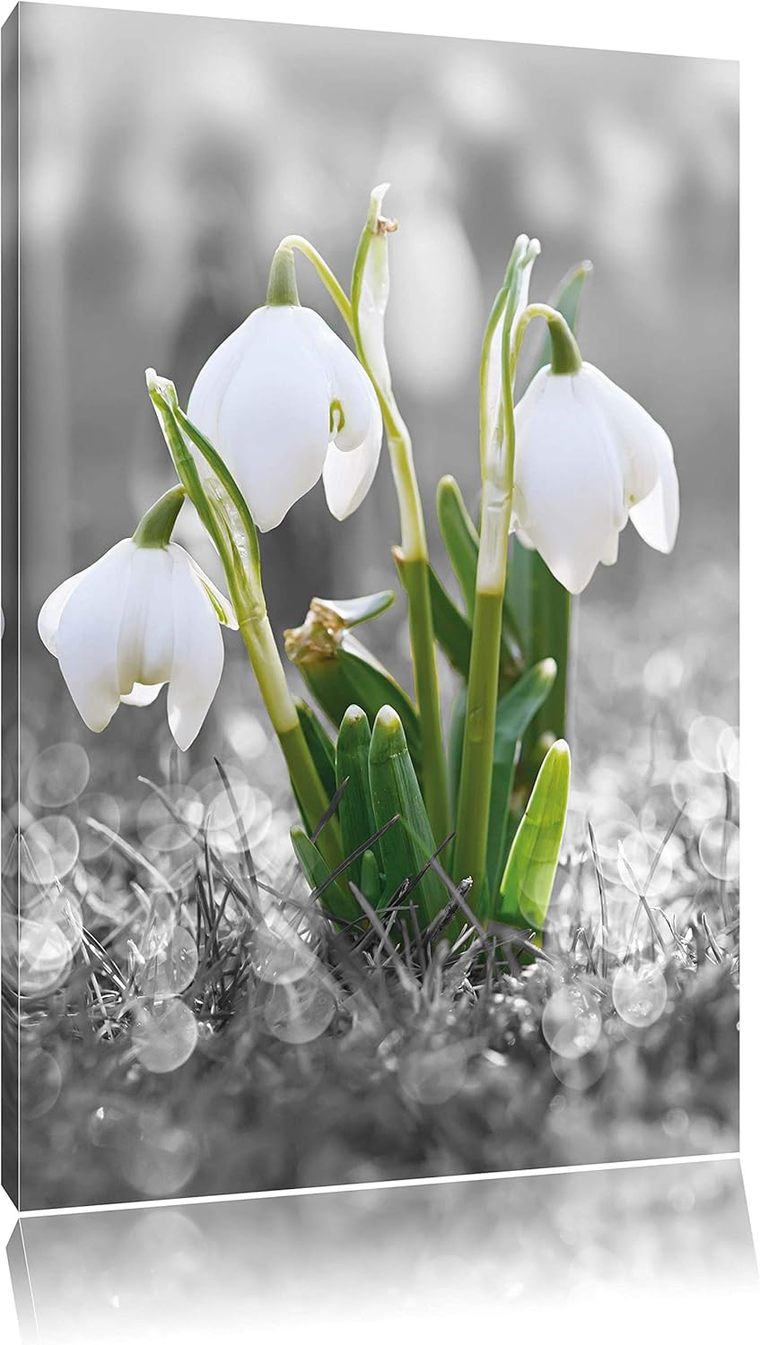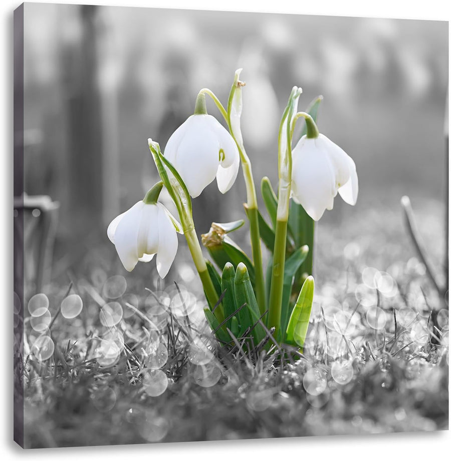 Pixxprint schöne Schneeglöckchen im Morgentau schwarz/weiss, Format: 70x70 auf Leinwand, 70x70