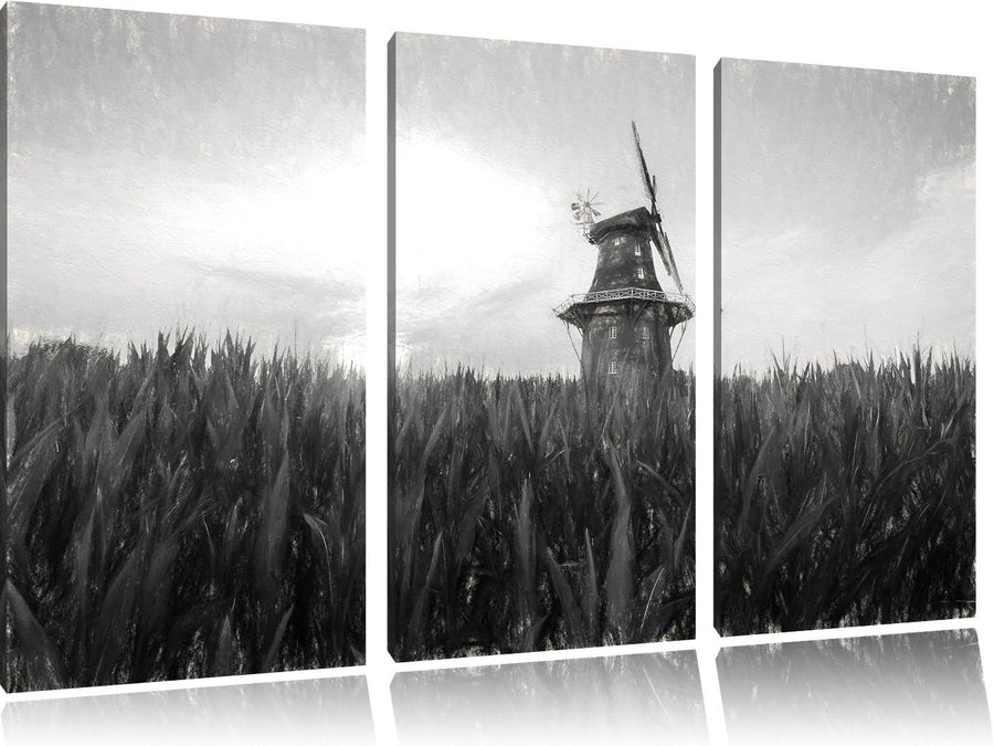 Pixxprint schöne Windmühle auf dem Feld Kunst Kohle Effekt 3-Teiler Leinwandbild 120x80 Bild auf Lei