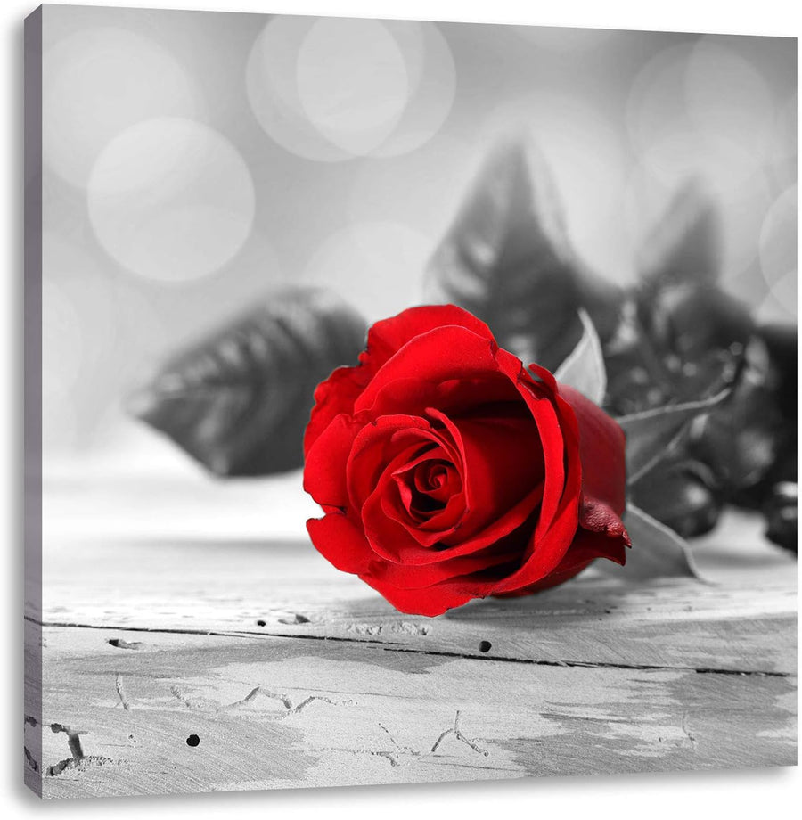 Pixxprint schöne Rose auf altem Holztisch schwarz/weiss, Format: 70x70 auf Leinwand, 70x70