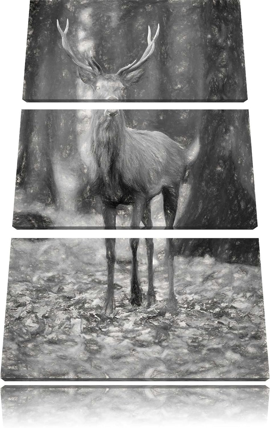 Pixxprint Schöner Hirsch im Wald Schwarz/Weiss 3-Teiler Leinwandbild 120x80 Bild auf Leinwand