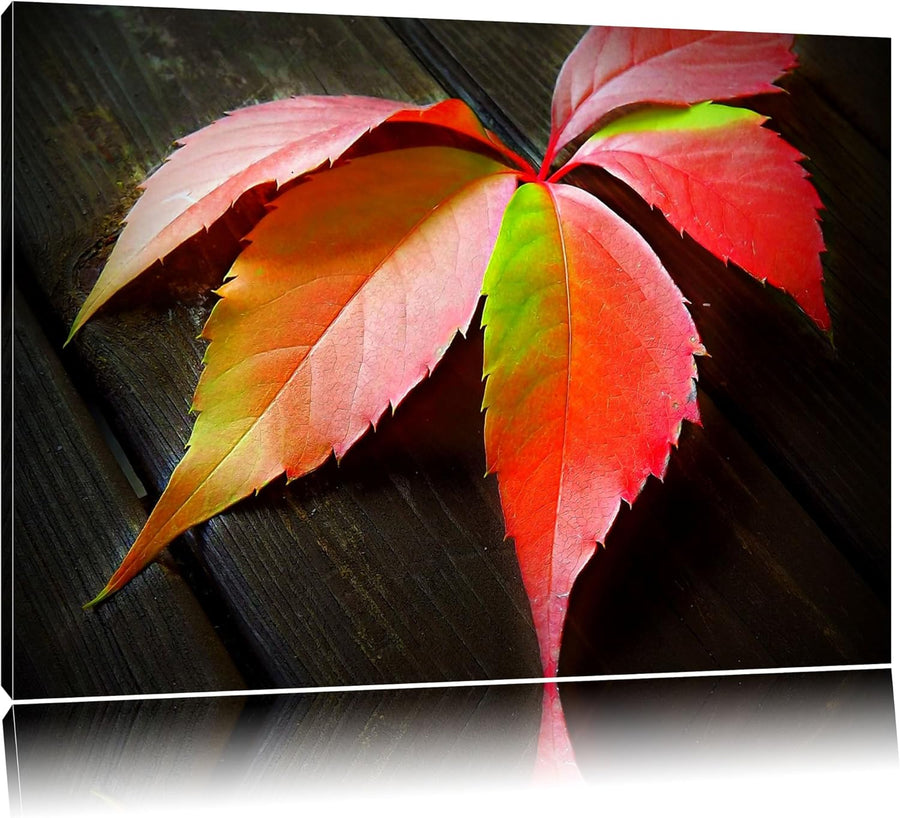 Pixxprint schönes Laubblatt auf Holz auf Leinwand, XXL riesige Bilder fertig gerahmt mit Keilrahmen,