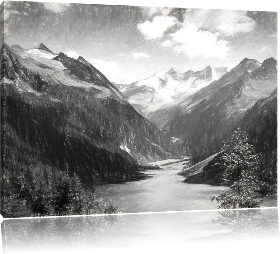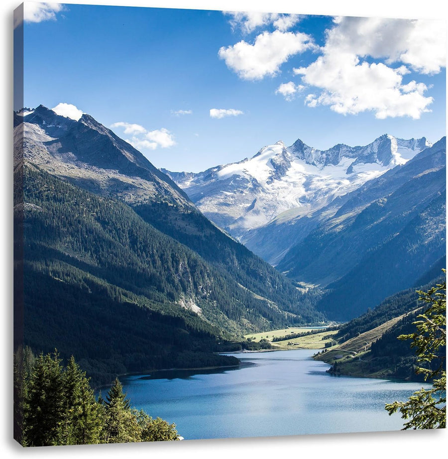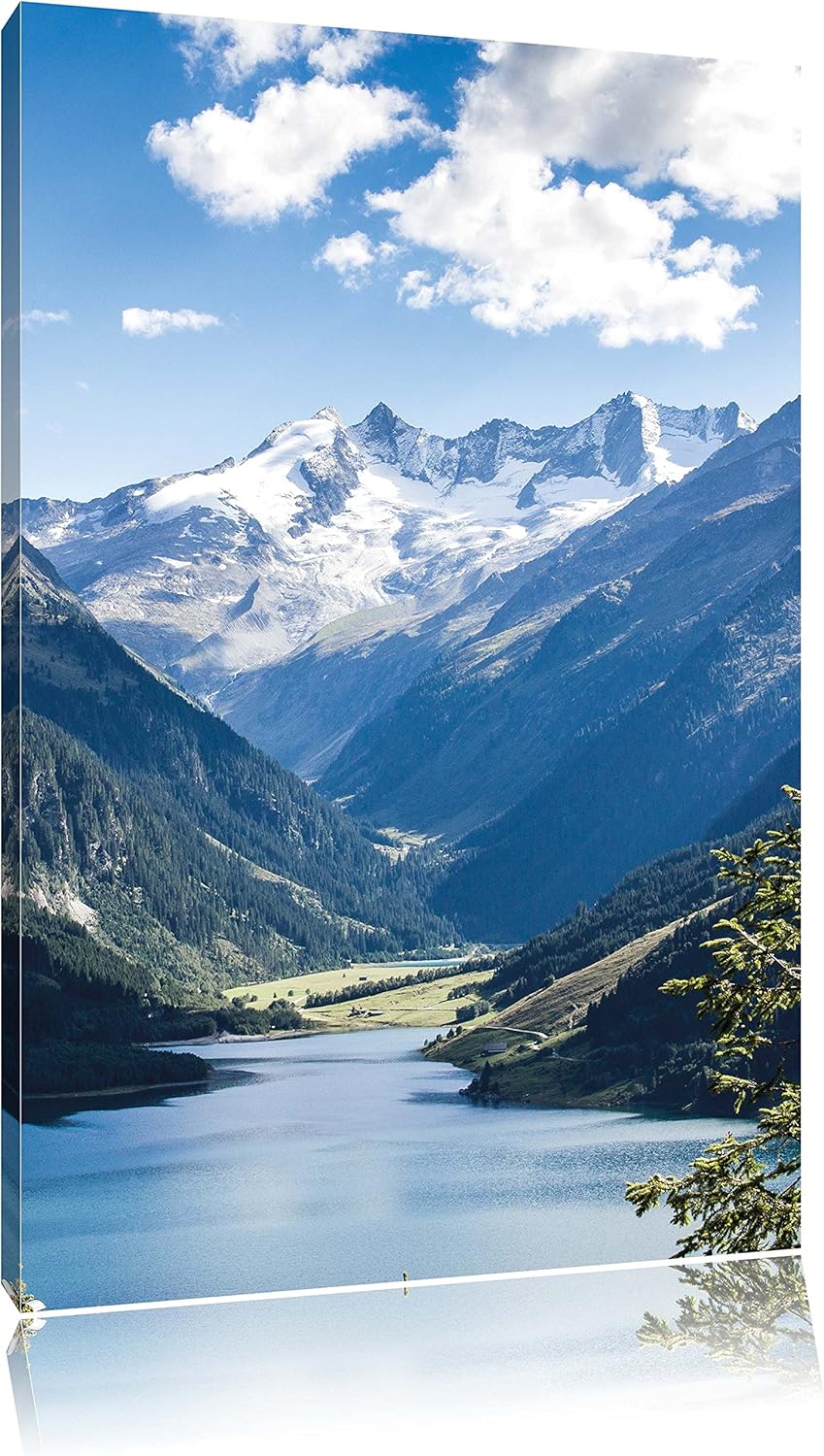 Pixxprint See zwischen Bergen als Leinwandbild/Grösse: 100x70 cm/Wandbild/Kunstdruck/fertig bespannt