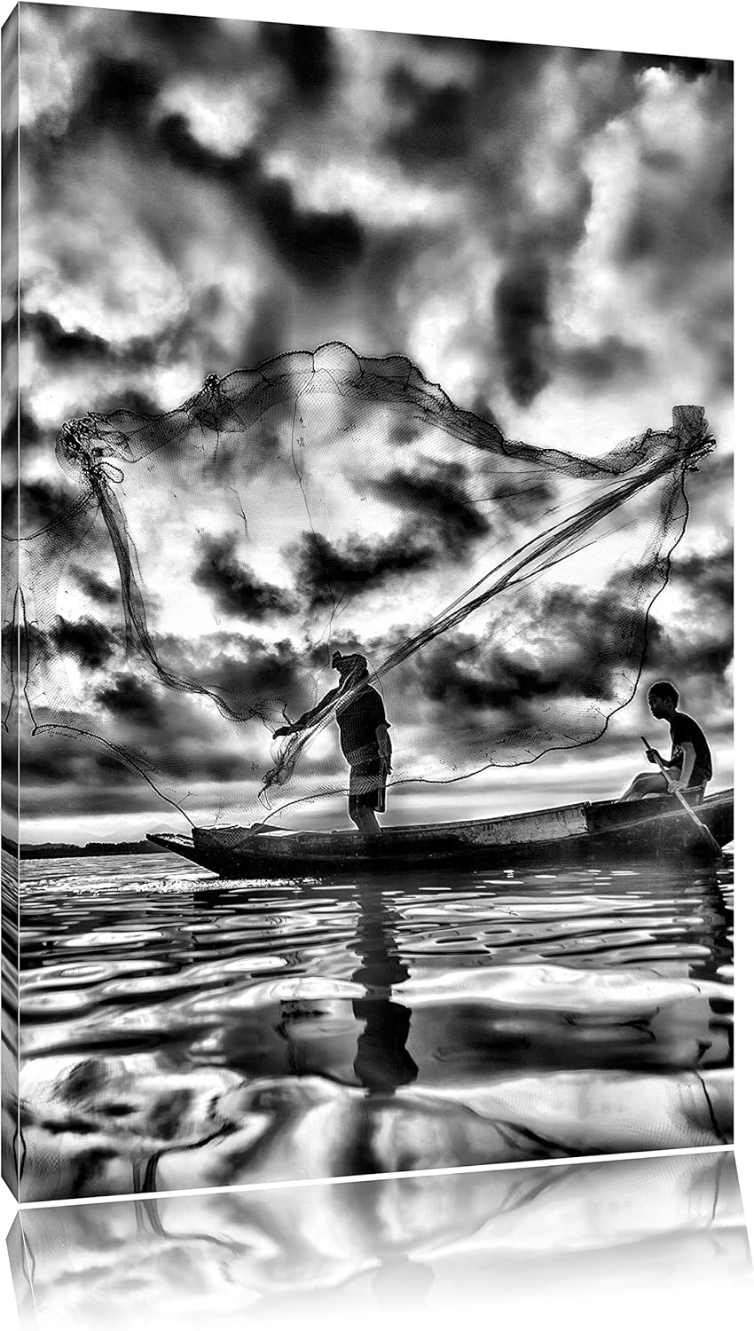 Pixxprint See mit Anglern / 100x70cm Leinwandbild bespannt auf Holzrahmen/Wandbild Kunstdruck Dekora