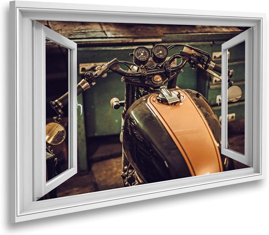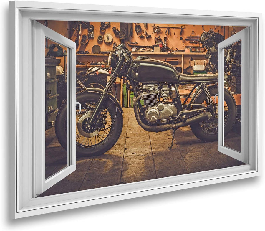 islandburner Bild auf Leinwand Fensterblick Caferacer Motorrad im Vintage Stil in der Zollgarage Sag