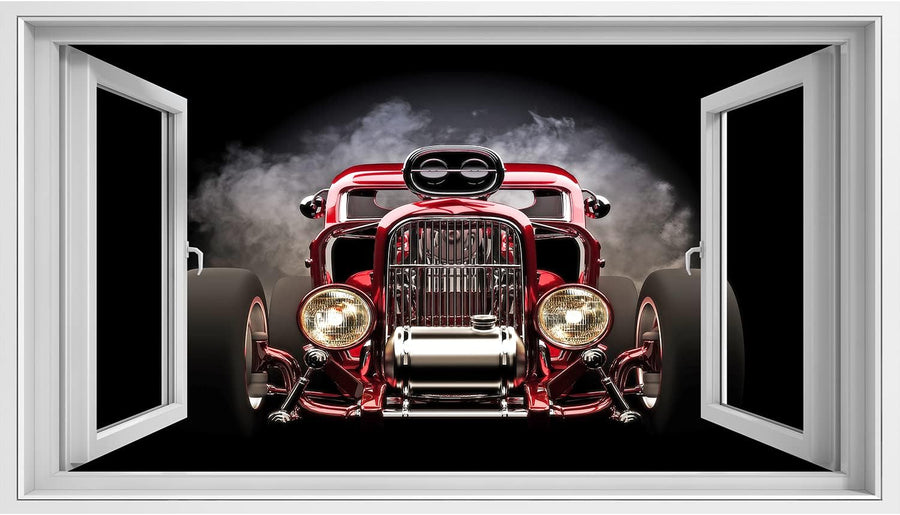 islandburner Bild auf Leinwand Fensterblick Hotrod mit Rauchhintergrund 3D Modell Sagenhafter Effekt