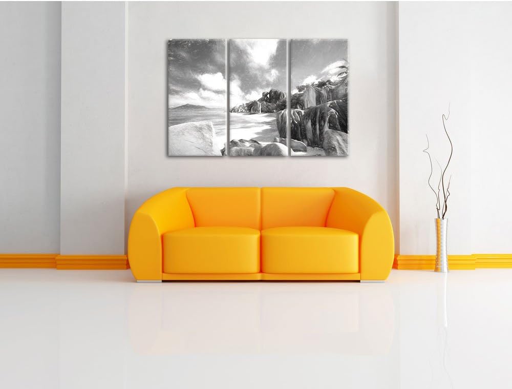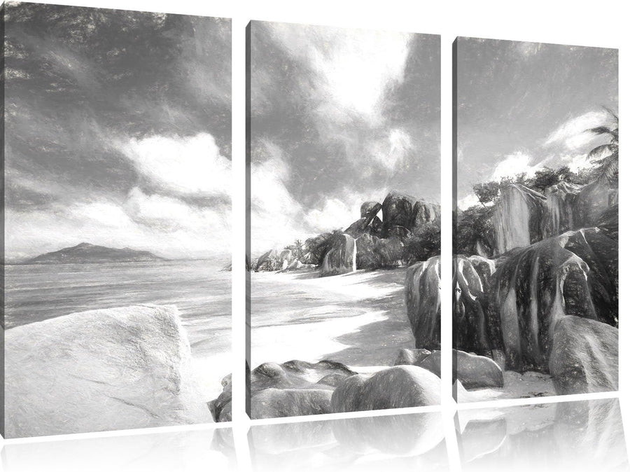 Pixxprint Seychellen Strand Kunst B&W 3-Teiler Leinwandbild 120x80 Bild auf Leinwand, riesige Bilder