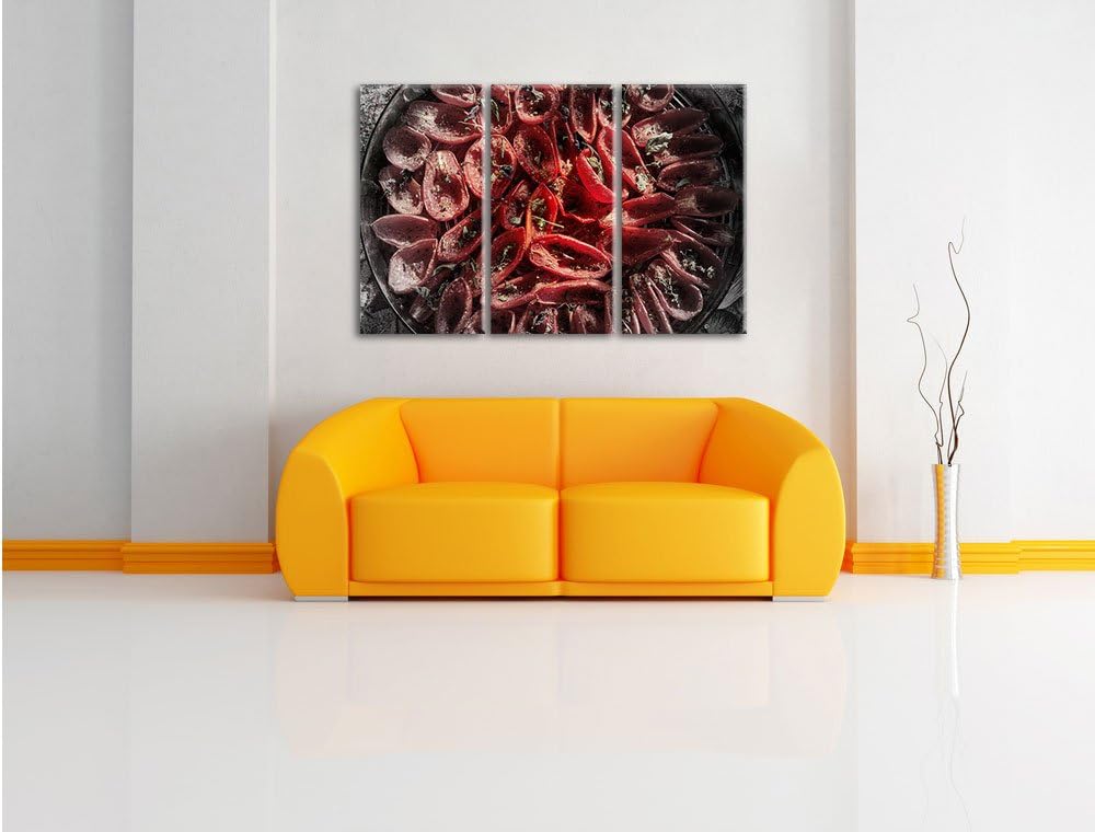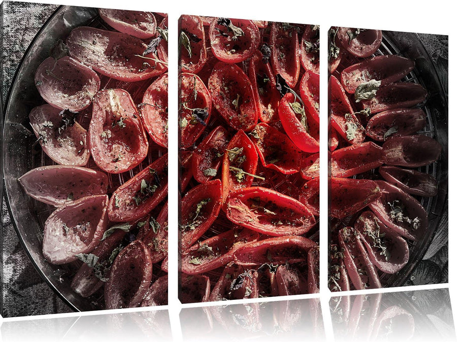 Pixxprint sonnengetrocknete Tomaten mit Olivenöl Basilikum und Kräuter B&W Detail 3-Teiler Leinwandb