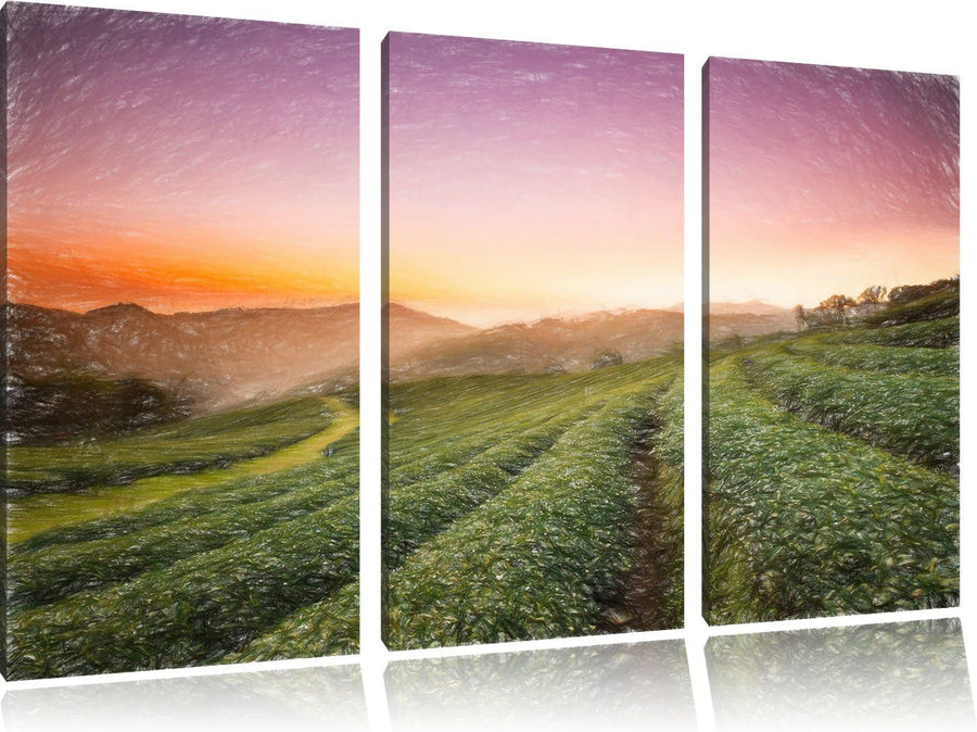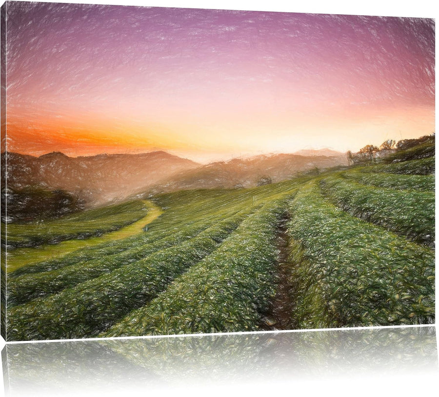 Pixxprint Sonnenaufgang Teeplantage Thailand Kunst Buntstift Effekt, Format: 100x70 auf Leinwand, XX
