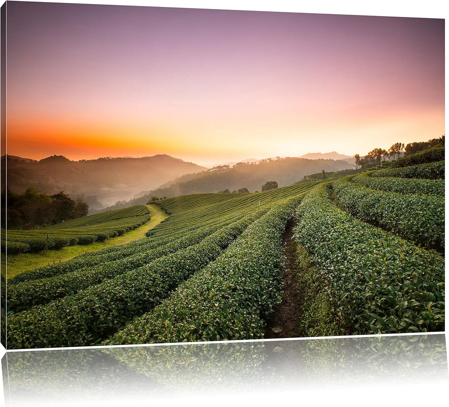 Pixxprint Sonnenaufgang Teeplantage Thailand / 100x70cm Leinwandbild bespannt auf Holzrahmen/Wandbil