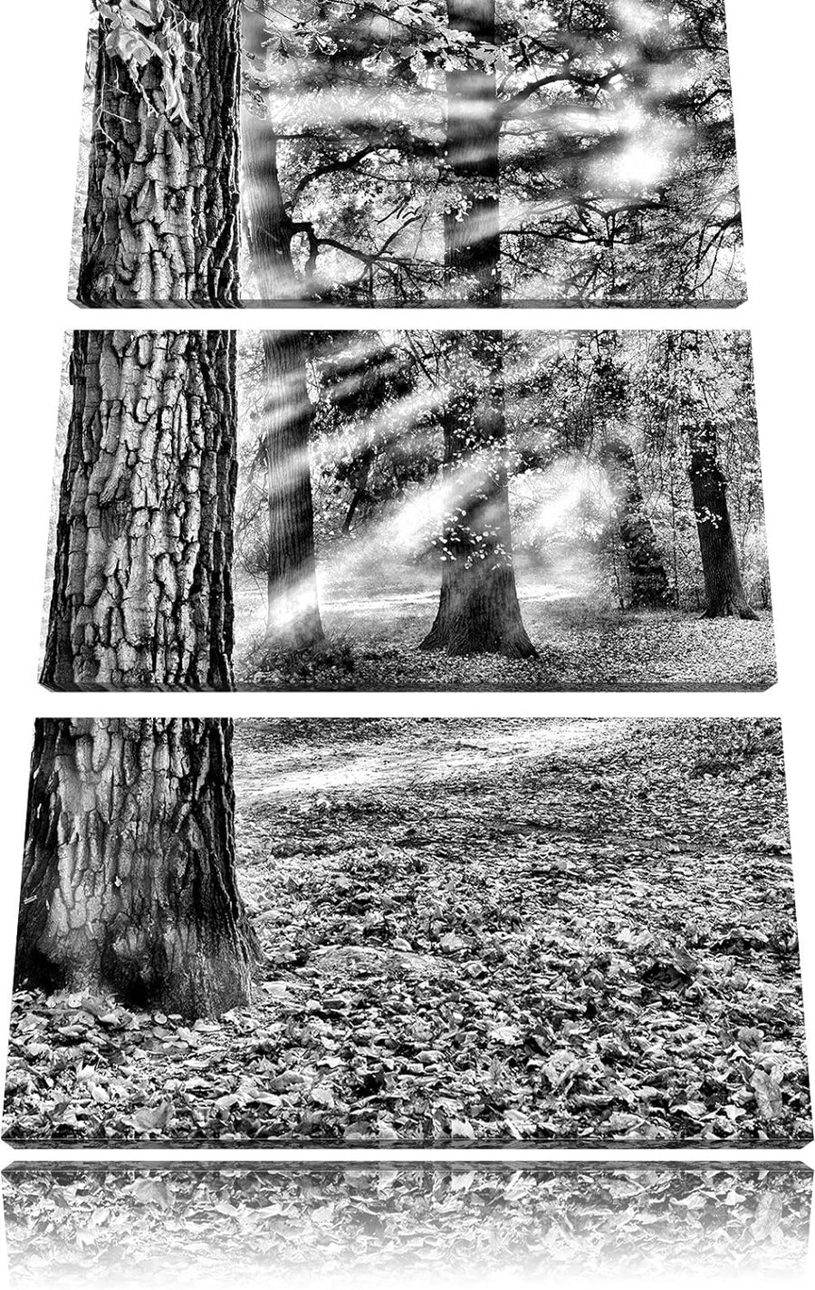 Pixxprint Sonnenstrahlenbedeckten Wald B&W / 3-Teilig/Gesamtmass 120cm Leinwandbild bespannt auf Hol
