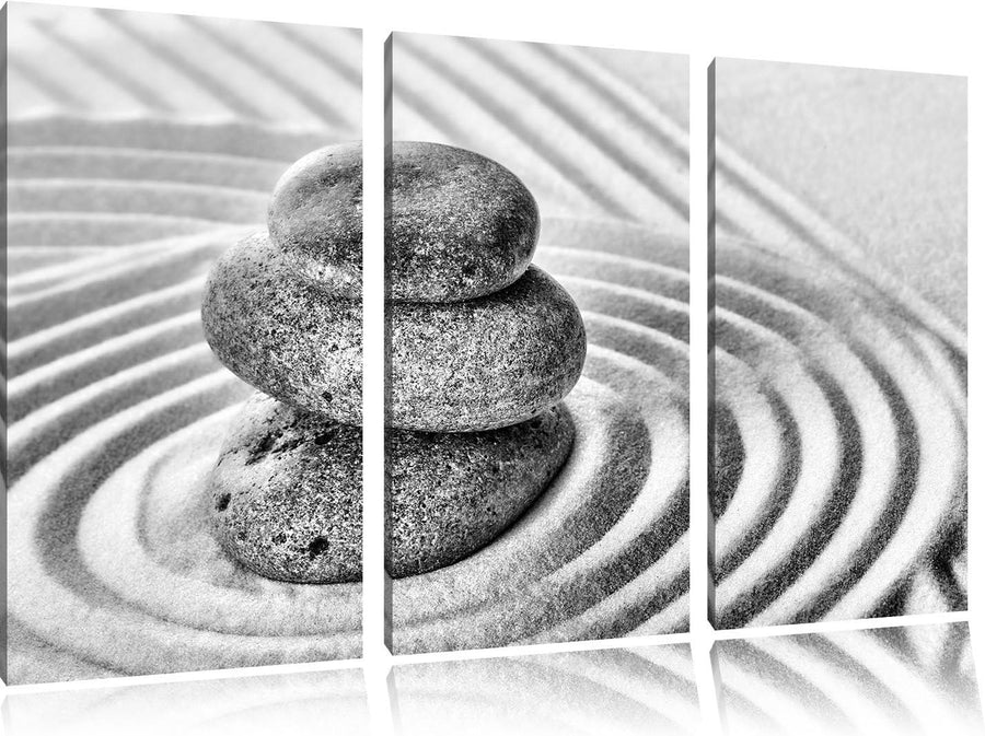 Pixxprint Steine im Sand mit Muster Pinsel Effekt 3-Teiler Leinwandbild 120x80 Bild auf Leinwand