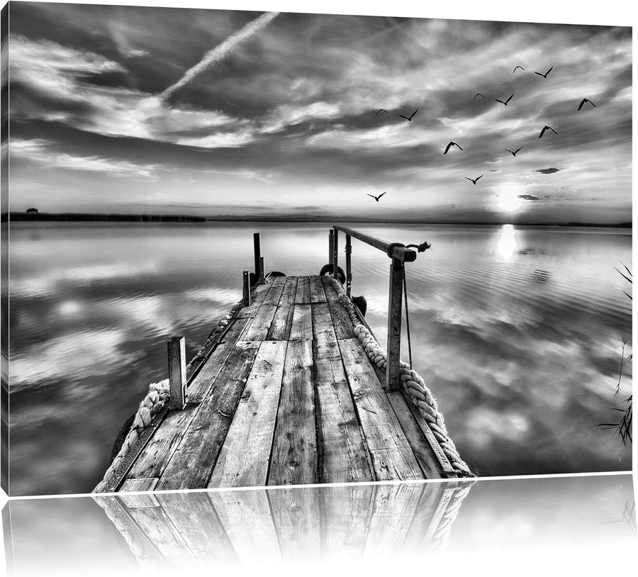 Pixxprint Steg ins Meer bei Sonnenuntergang Schwarz/Weiss, Format: 70x70 auf Leinwand, 70x70