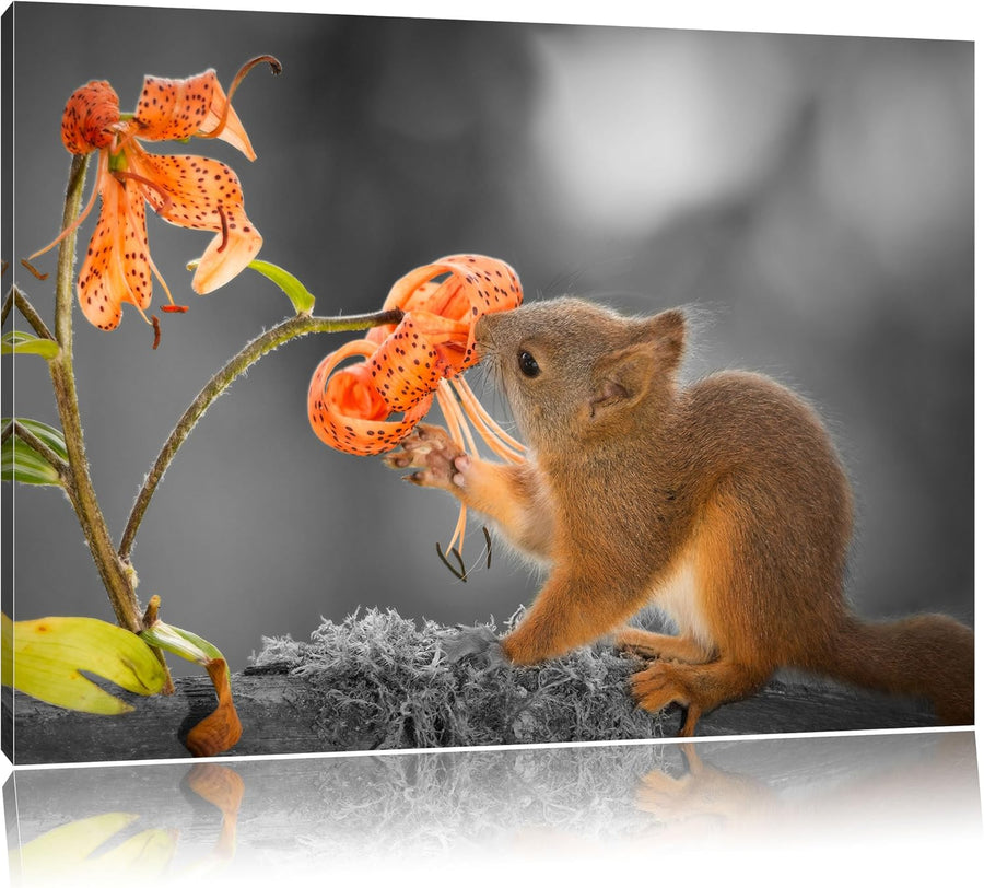 Pixxprint süsses Eichhörnchen riecht an Einer Blume Kunst B&W, Format: 100x70 auf Leinwand, XXL ries
