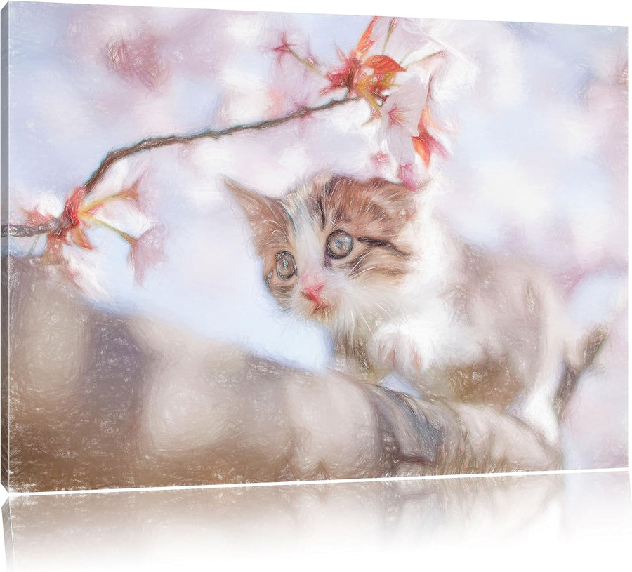 Pixxprint Süsses Kätzchen im Kirschbaum Kunst Buntstift Effekt, Format: 100x70 auf Leinwand, XXL rie