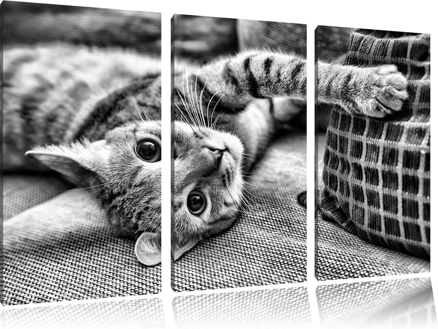 Pixxprint Süsses Kätzchen spielt als Leinwandbild/Grösse: 3 Teilig (120x80) cm/Wandbild/Kunstdruck/f