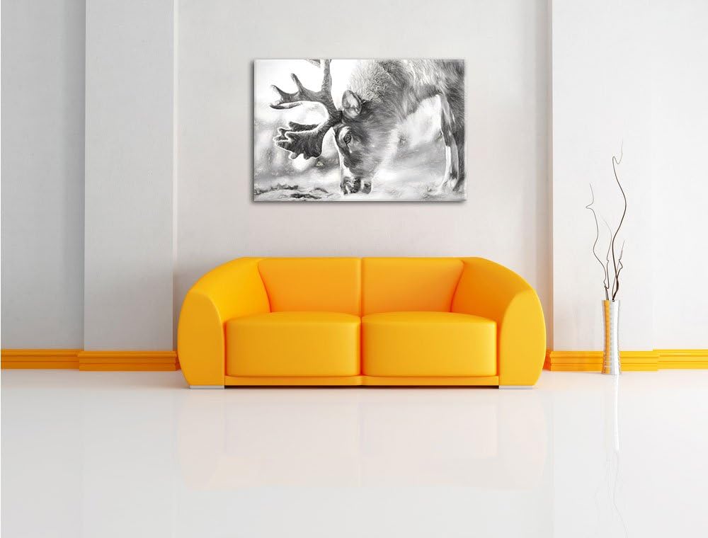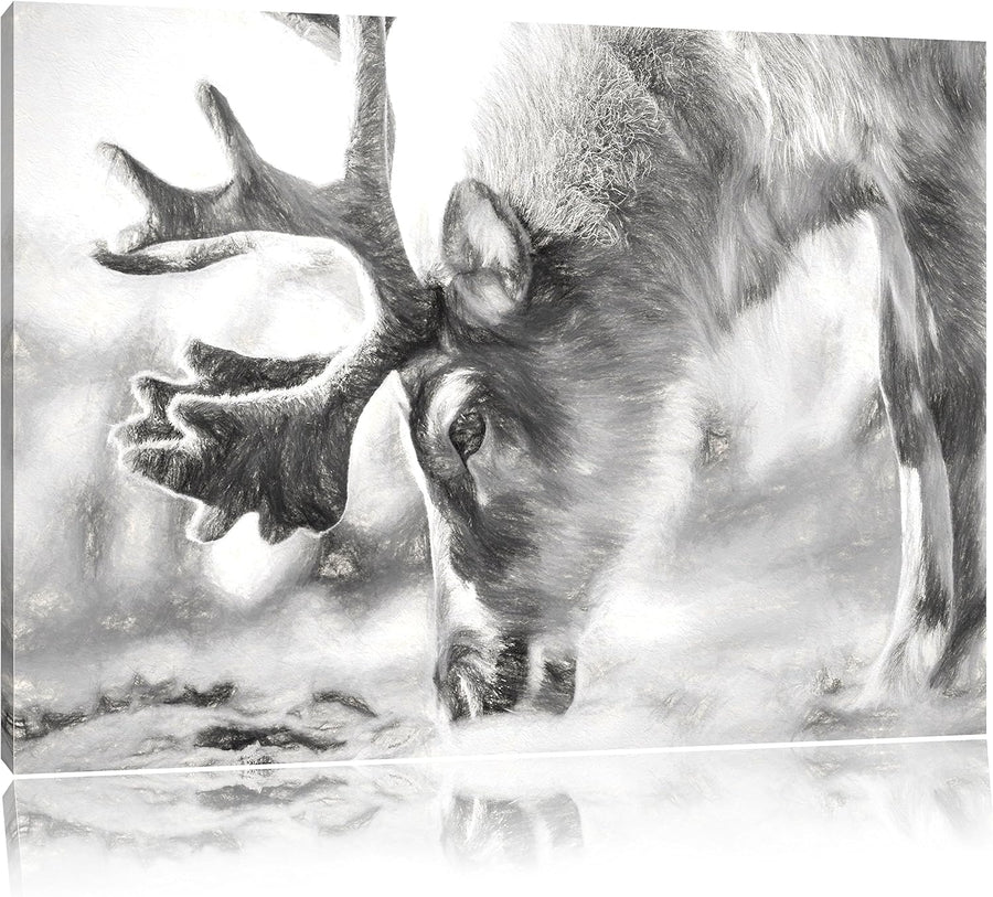 Pixxprint süsses Rentier beim Essen Kunst B&W als Leinwandbild/Grösse: 100x70 cm/Wandbild/Kunstdruck