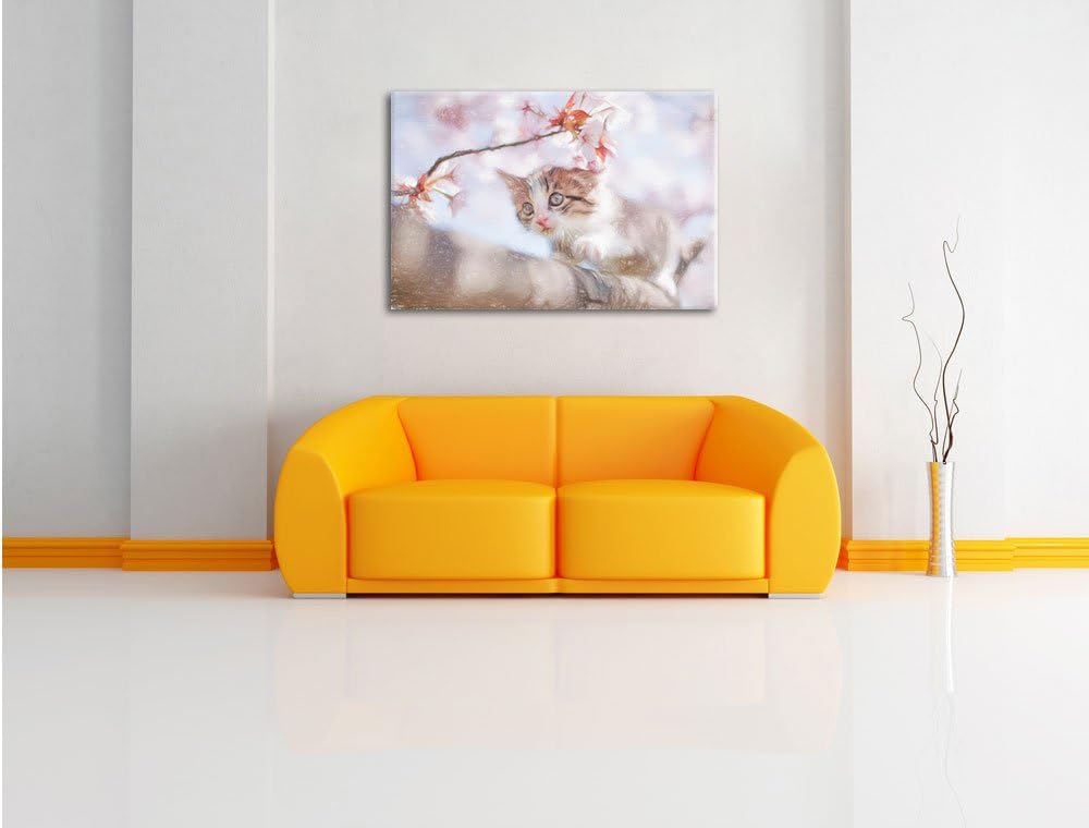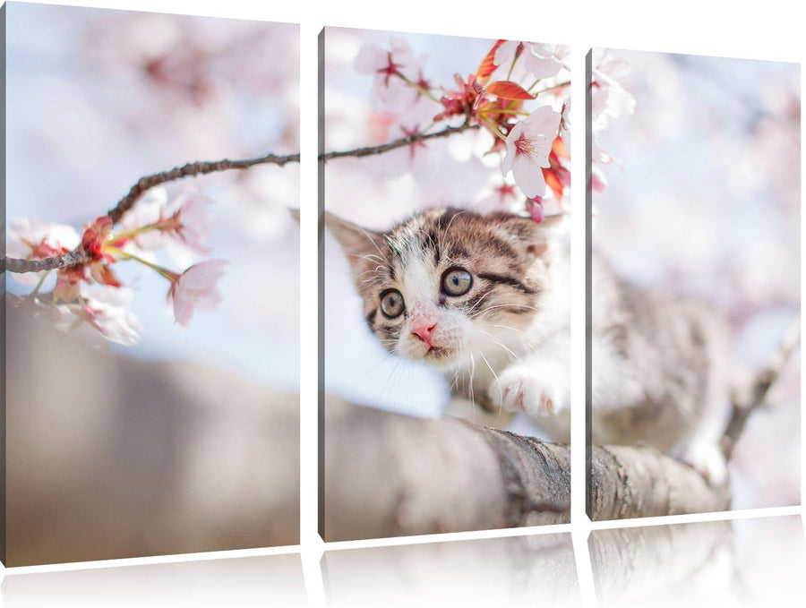 Pixxprint Süsses Kätzchen im Kirschbaum Kunst als Leinwandbild 3 teilig/Grösse: 3 Teilig (120x80) /