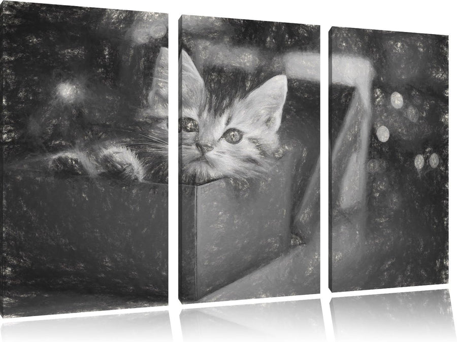 Pixxprint süsses Kätzchen in der Box Kunst Kohle Effekt 3-Teiler Leinwandbild 120x80 Bild auf Leinwa