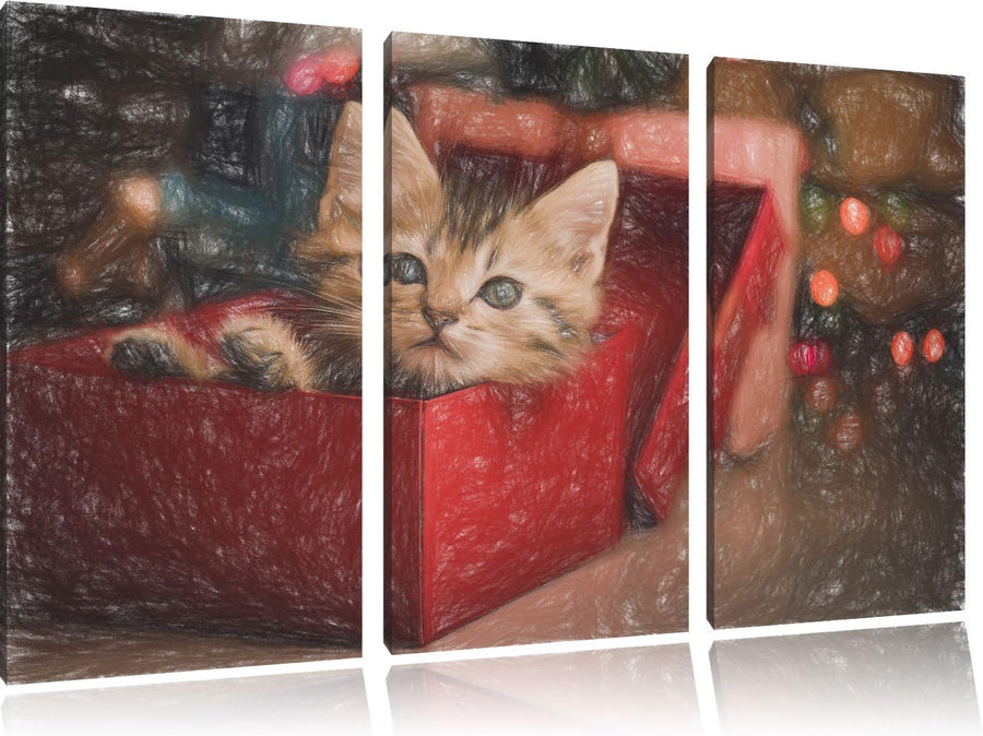 Pixxprint süsses Kätzchen in der Box Kunst Buntstift Effekt 3-Teiler Leinwandbild 120x80 Bild auf Le