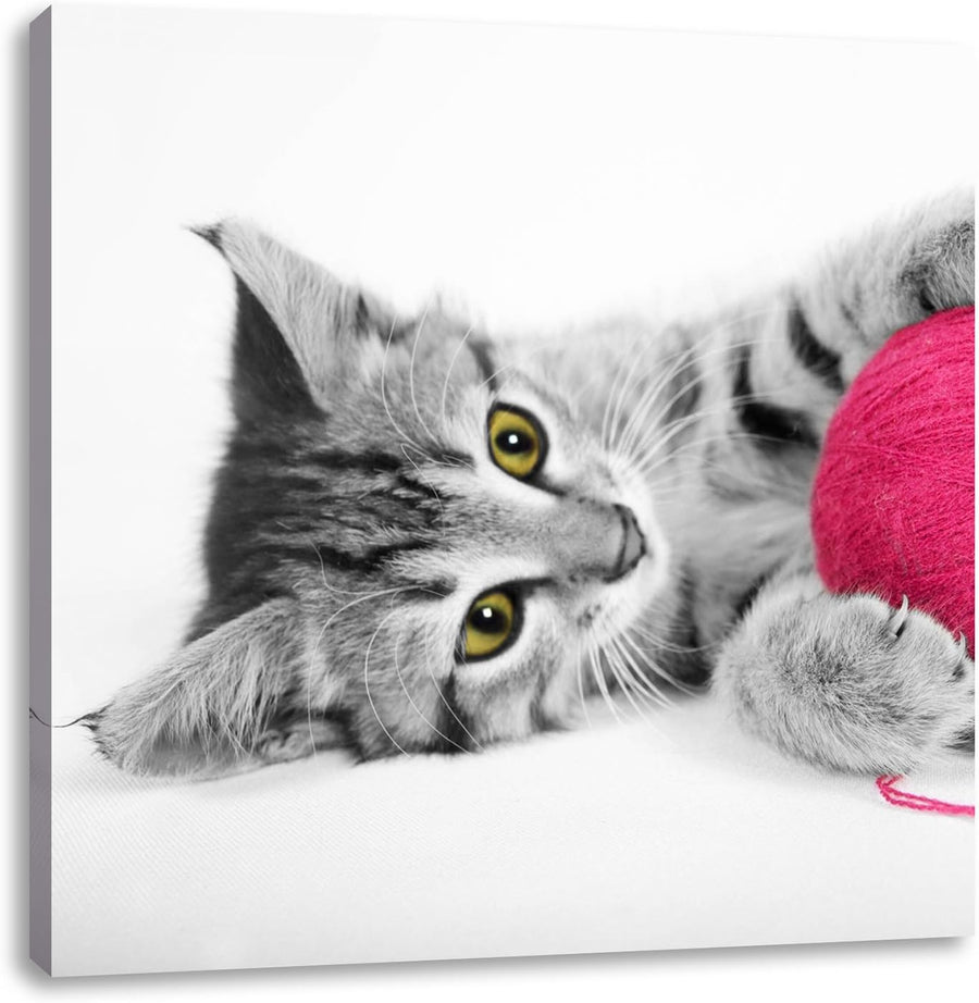 Pixxprint süsses Kätzchen mit Wollknäuel schwarz/weiss, Format: 70x70 auf Leinwand, 70x70