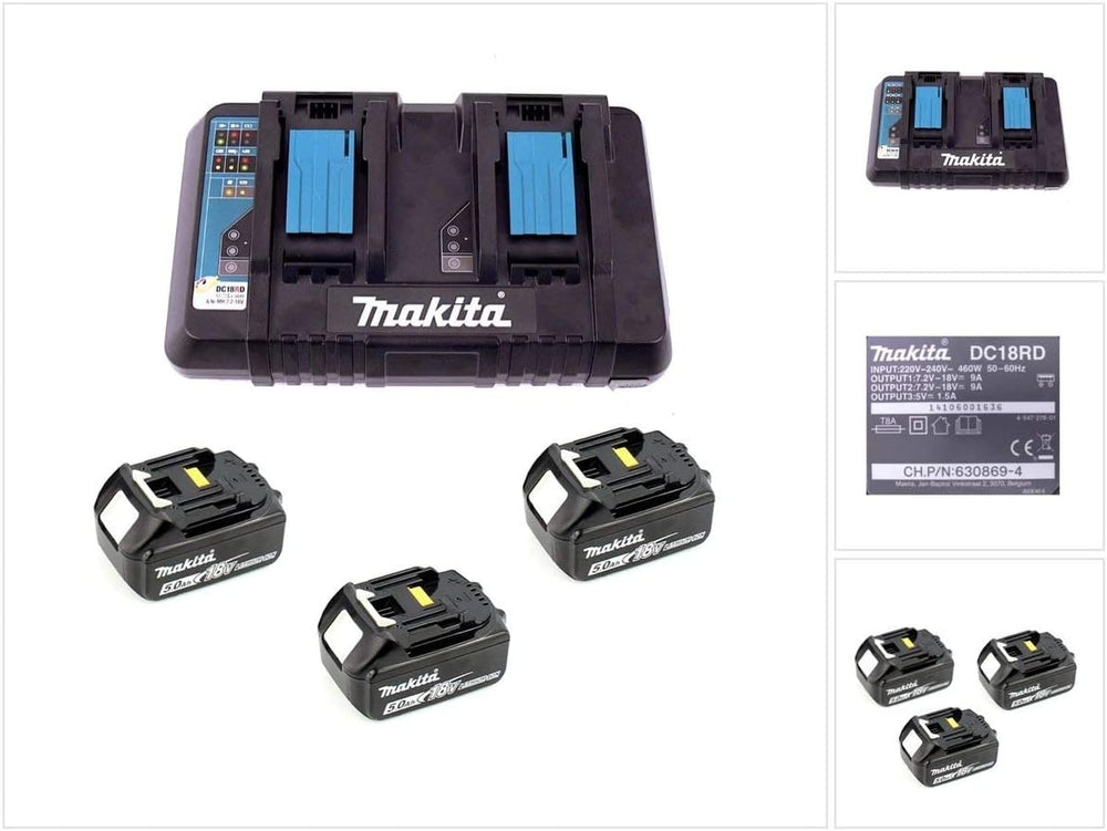 Makita Stromquellen-Set mit Doppel-Ladegerät + 3 Akkus (dc18rd, 18 V, 5 Ah), Blau/Silber, 198458-6