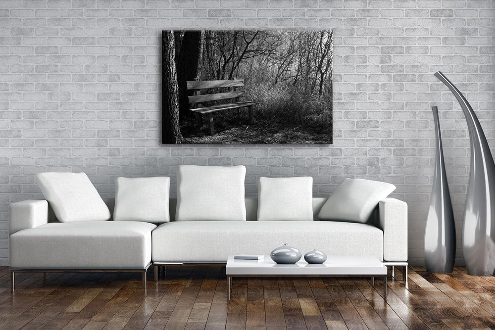 deyoli einsame Bank im Wald Format: 60x40 Effekt: Schwarz/Weiss als Leinwandbild Motiv fertig gerahm