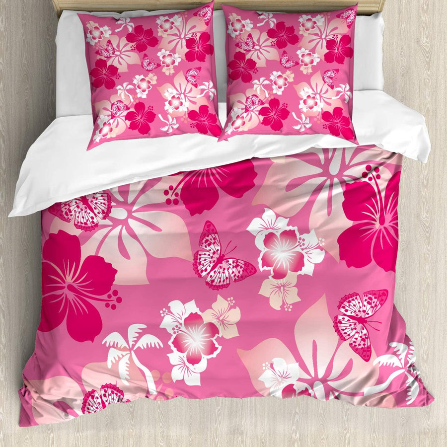 ABAKUHAUS Luau Bettwäsche Set für Doppelbetten, Hibiscus rosa Schmetterlinge, Weicher Microfaserstof