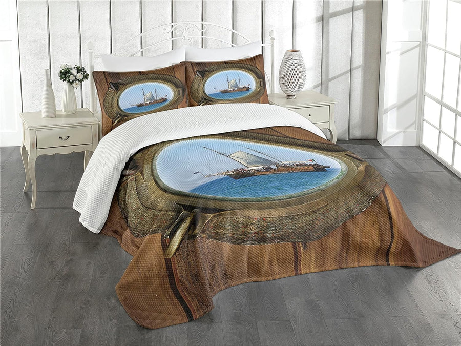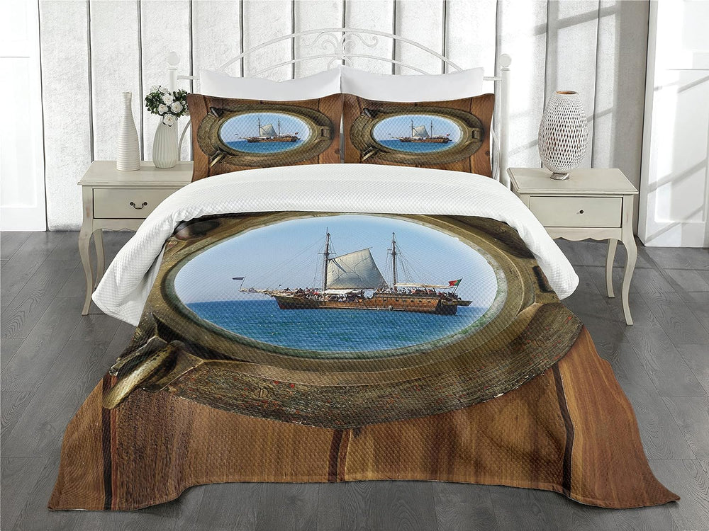 ABAKUHAUS Marine Tagesdecke Set, Schiffsfenster mit Cruise, Set mit Kissenbezügen Mit Digitaldruck,