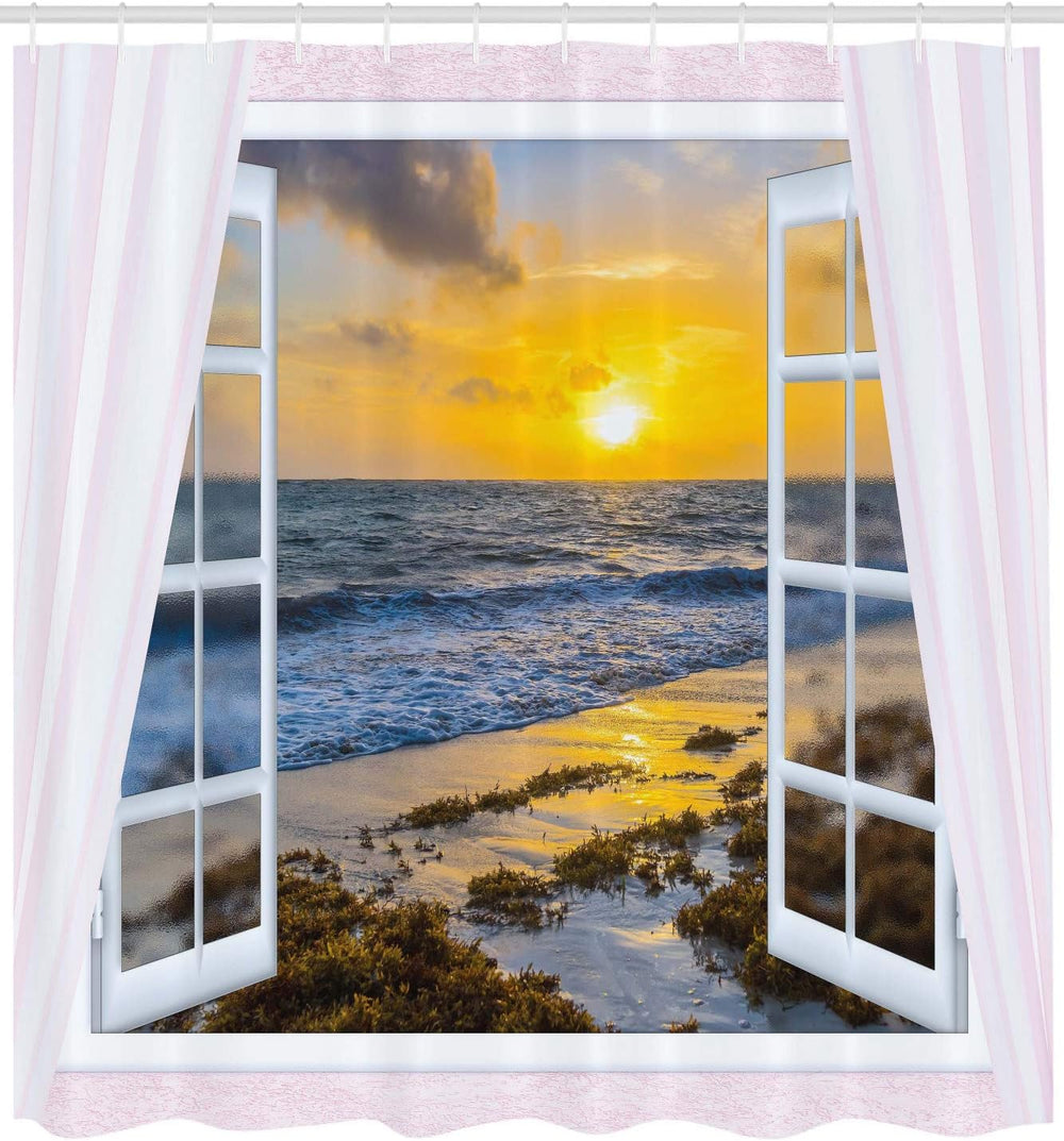 ABAKUHAUS Küsten Duschvorhang, Open Window Sonnenaufgang Meer, Stoffliches Gewebe Badezimmerdekorati
