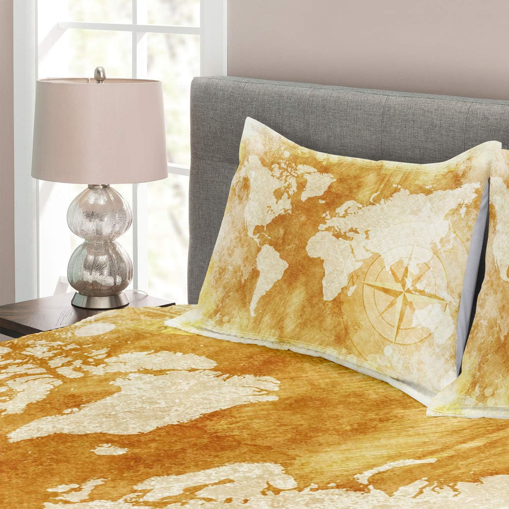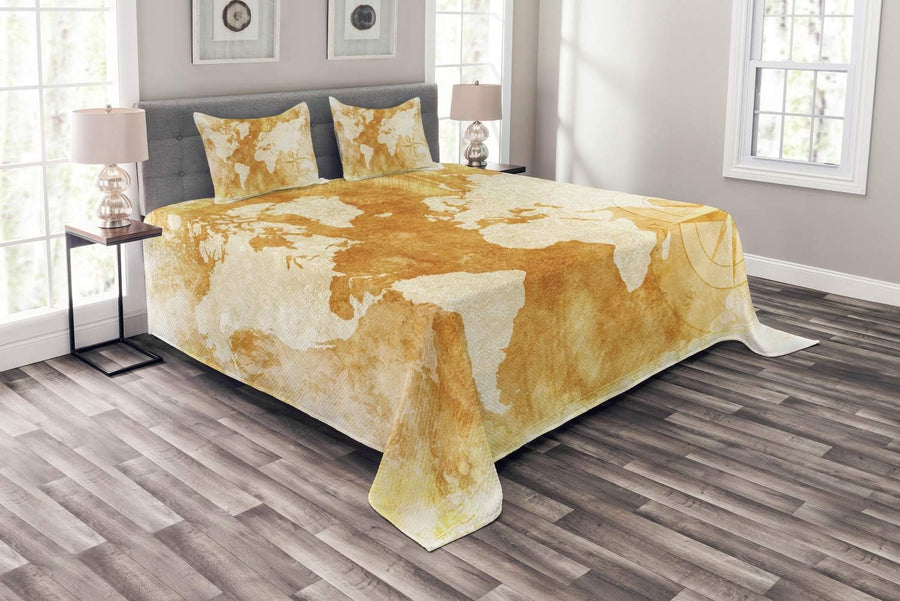 ABAKUHAUS Kompass Tagesdecke Set, Altmodische Weltkarte, Set mit Kissenbezügen farbfester Digitaldru