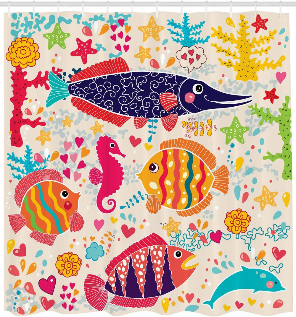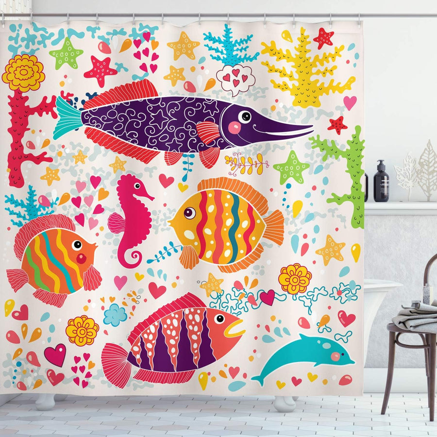 ABAKUHAUS Kids Duschvorhang, Cartoon Unterwasser Fisch, mit 12 Ringe Set Wasserdicht Stielvoll Moder