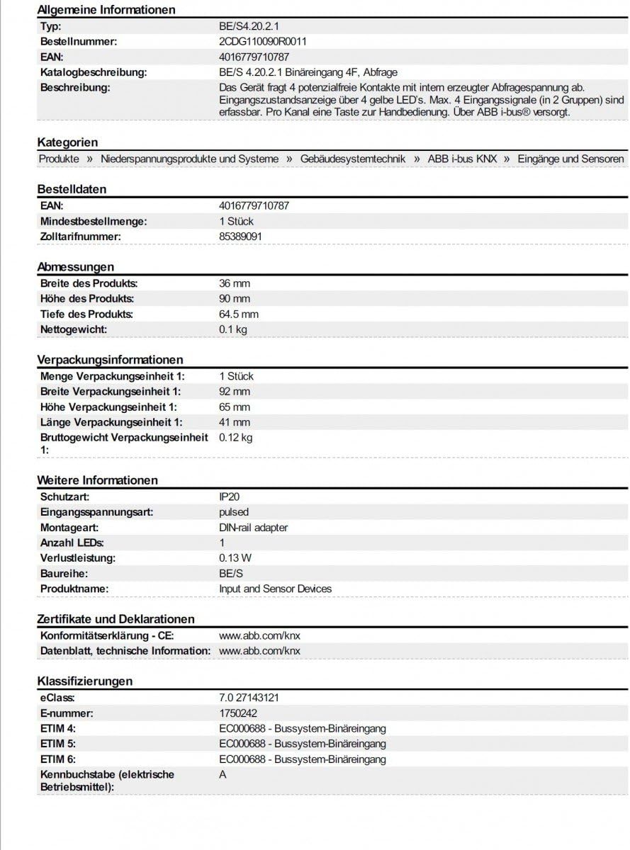 ABB Stotz 1844986 Binäreingang 4 Fach, Kontaktabfrage, REG, 2 Teilungseinheiten, Be-S4.20.2.1, Grau