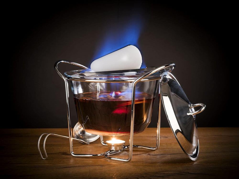 APS Fondue- und Feuerzangenbowle Set, Zuckerzange, Feuerzange, Fondue-Topf, Edelstahldeckel, hochgla