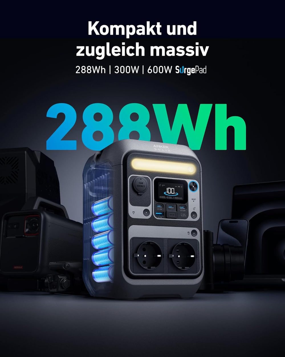 Anker SOLIX C300 Tragbare Powerstation, 288Wh LiFePO4 Akku, 300W (Max 600W) Solargenerator, 140W Bei