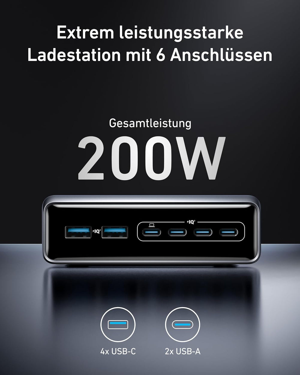 Anker Prime Ladegerät, 200W 6 Anschlüsse GaN Ladestation, USB-C PD Desktop Ladegerät mit Schnell-Lad