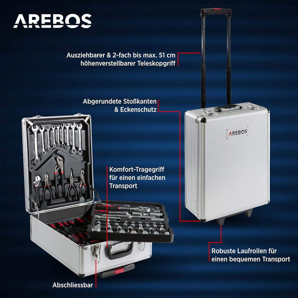 Arebos Werkzeugkoffer | Werkzeug-Set | 1200 Teile | Rollkoffer Tragekoffer | für Haushalt, Garage &