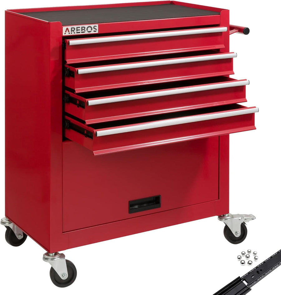 Arebos Werkstattwagen 4 Fächer + grosses Fach für Werkzeug | inkl. Antirutschmatten |kugelgelagerte