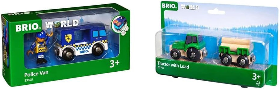 BRIO Bahn 33825 - Polizeiwagen mit Licht und Sound & Bahn 33799 - Traktor mit Holz-Anhänger Polizeiw