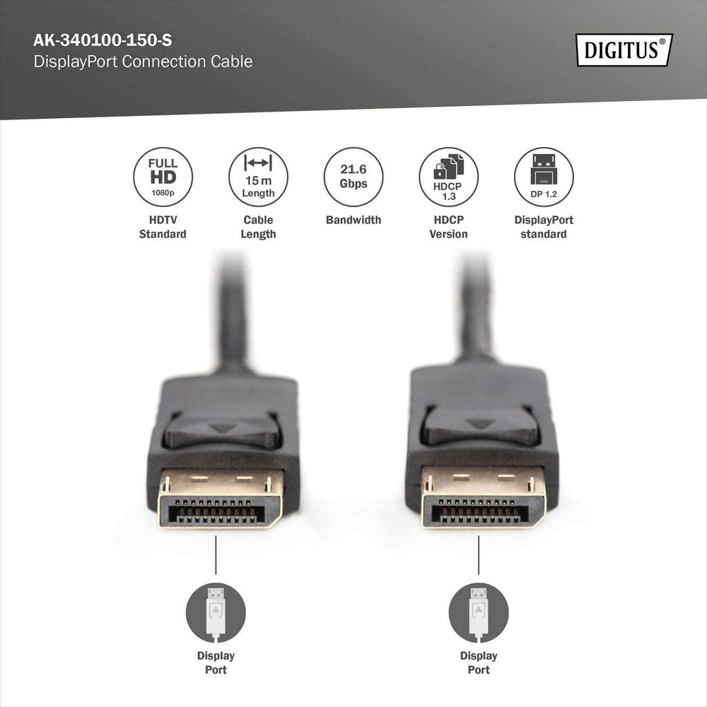 DIGITUS DisplayPort Anschlusskabel, DP St/St, 15.0m, m/interlock, Full HD 1080p - Schwarz Polybag 15
