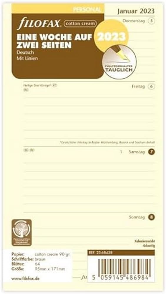 Filofax Personal 1 Woche auf 2 Seiten cotton creme (deutsch)2023 Single, Single