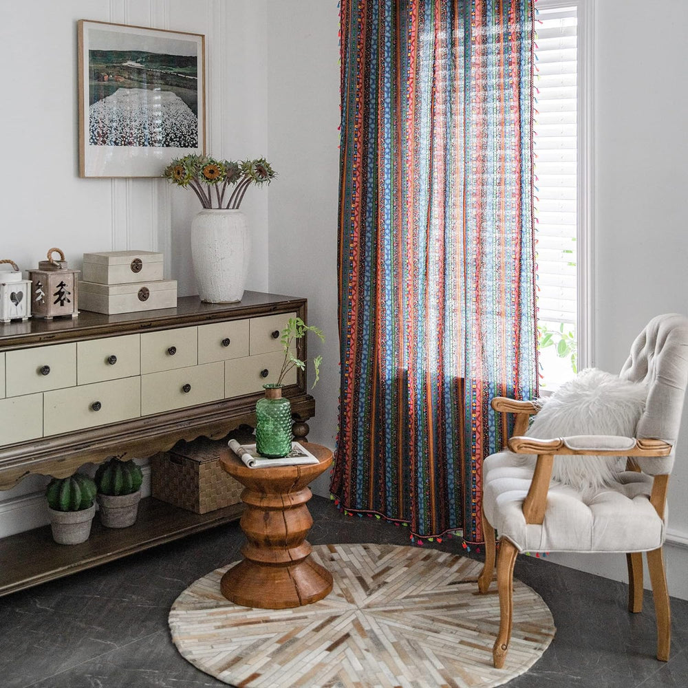 Freyamy Vorhang 160x150cm Boho Bunt Gelb Baumwolle Leinen Landhausstil Vintage Vertikale Streifen Bl