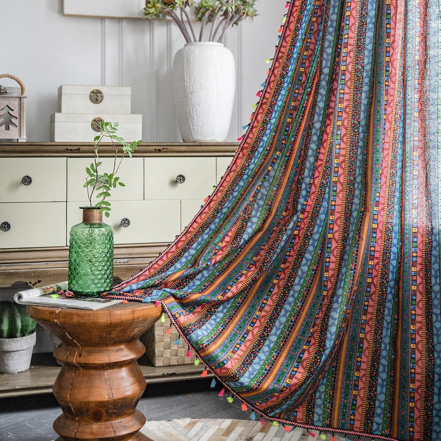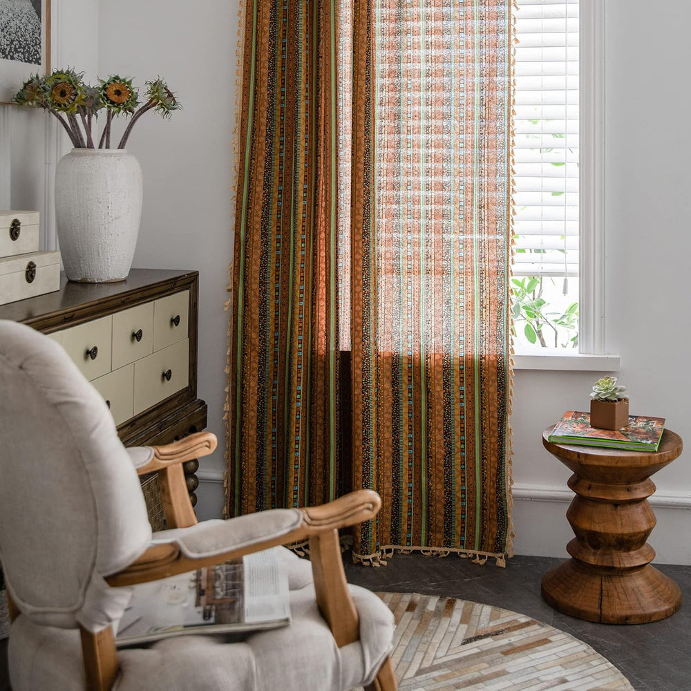 Freyamy Vorhang 160x150cm Boho Bunt Grün Baumwolle Leinen Landhausstil Vintage Vertikale Streifen Bl