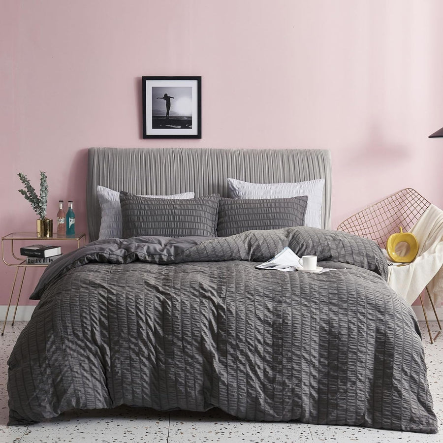 Freyamy Seersucker Bettwäsche 220x240cm 3teilig Grau Geprägt Streifen Strukturiert Bettwaren-Sets Un