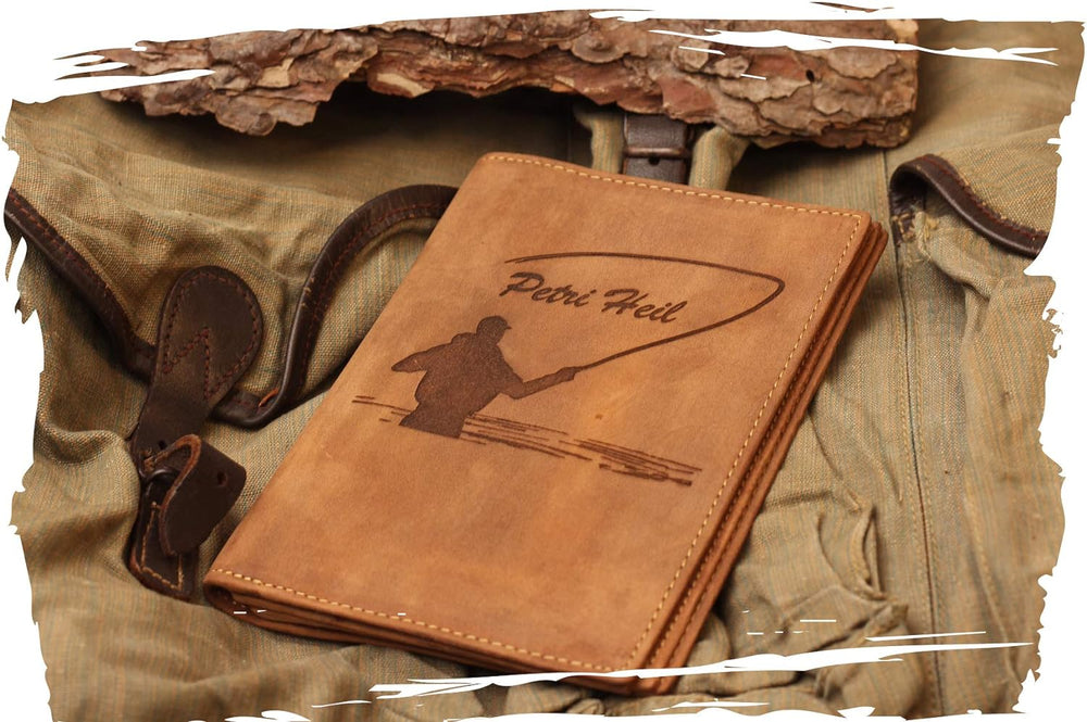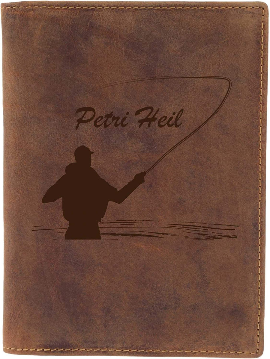Greenburry Leder-Ausweismappe mit Petri Heil Motiv - Leder Angelausweis-Mappe - 16,5x12cm