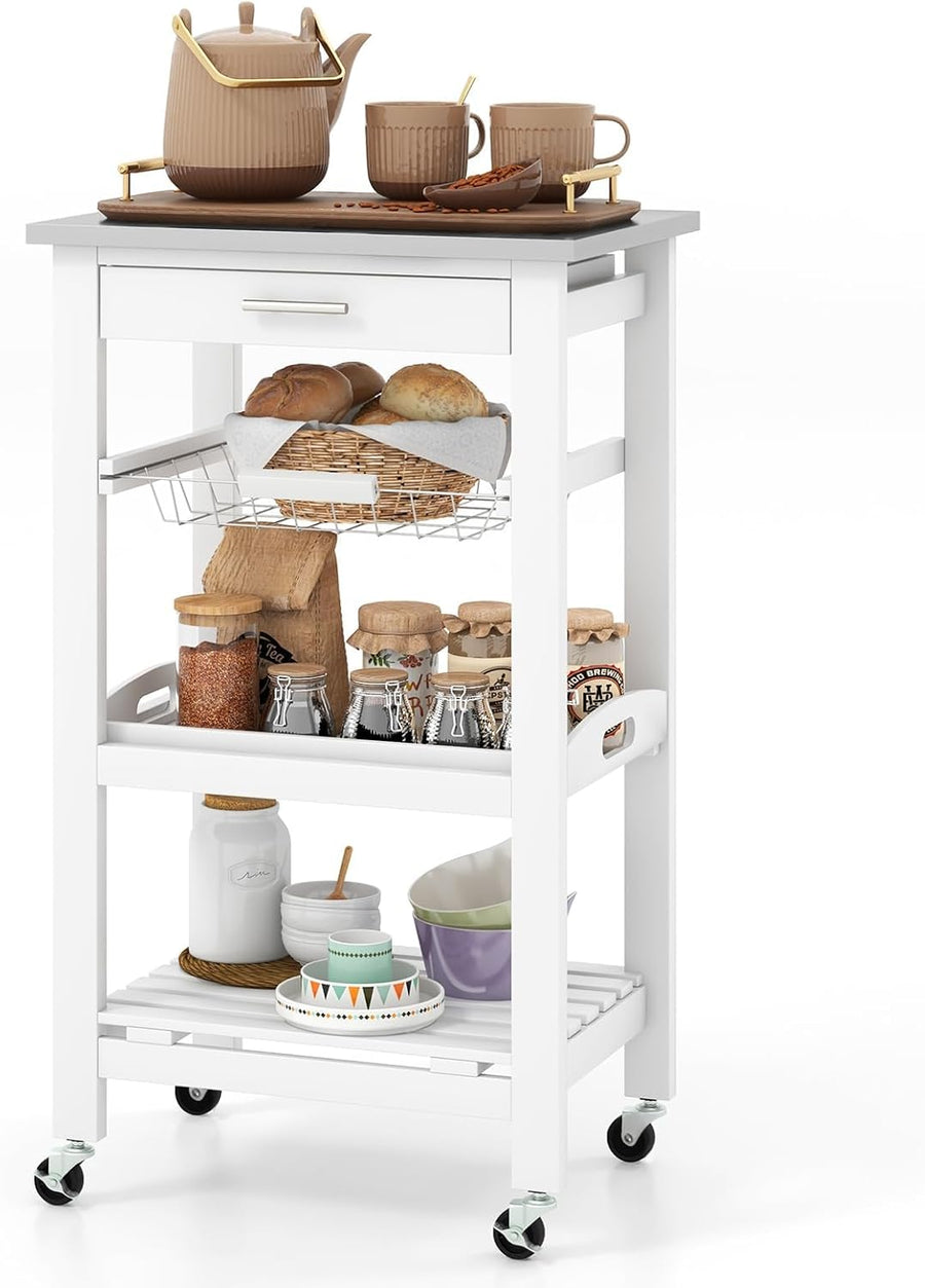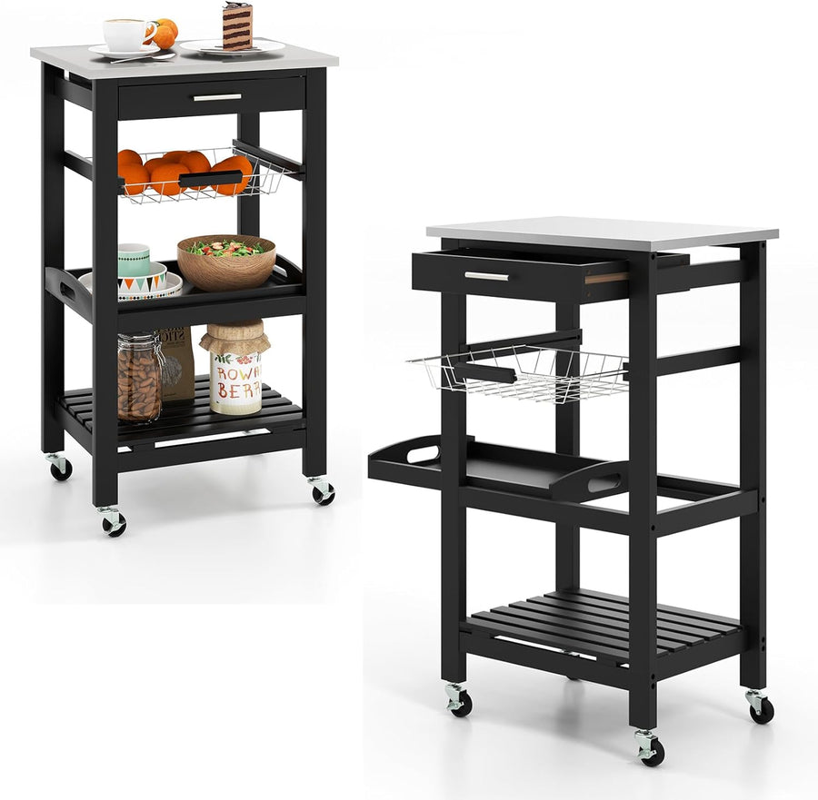 KOMFOTTEU Servierwagen mit Edelstahl Arbeitsplatte, Küchenwagen Klein, Rollwagen mit Schublade & Abl