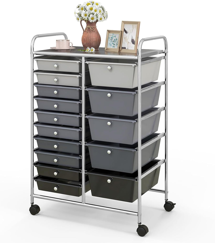 KOMFOTTEU Trolley mit 15 Schubladen, stapelbar, Verriegelungsrollen, metallschoniger Rahmen, für Bür