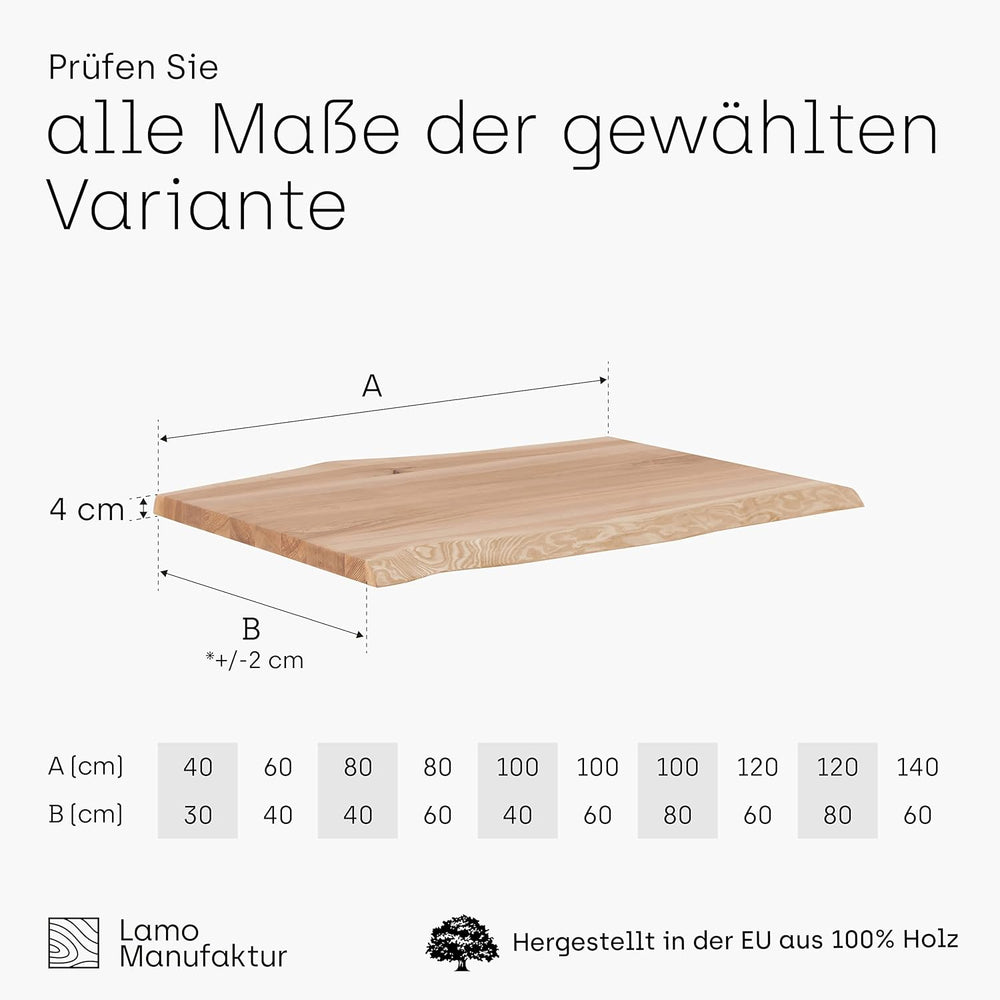 LAMO Manufaktur Massivholzplatte für Couchtisch Arbeitsplatte Küchenarbeitsplatte 80x40 cm, Natur, L